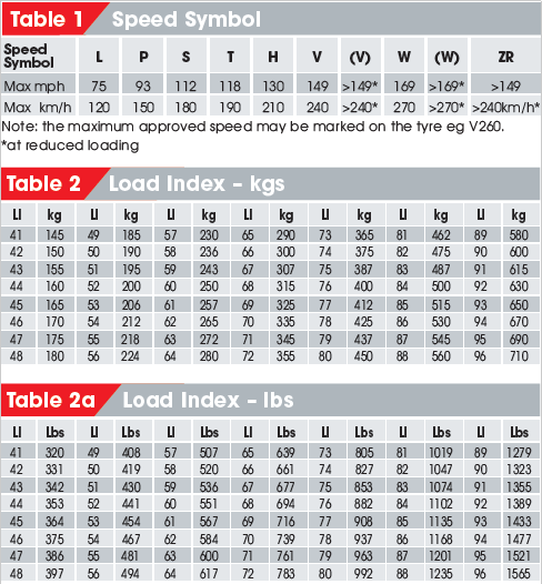 Queste velocità sono indicate nella Tabella 1 e si applicano agli pneumatici quando sono in buone condizioni, gonfiati alla pressione corretta, operando all’interno della loro specifica capacità di carico e montati sul cerchio delle dimensioni corrette. Le velocità indicate sono la velocità massima per le capacità dello pneumatico, non la velocità alla quale è normalmente guidato. Pneumatici V, W e Z possono essere utilizzati anche a velocità più elevate ma con carichi ridotti. A titolo indicativo, la tabella 3 può essere utilizzata per calcolare i carichi a determinate velocità su pneumatici V, W e Z.